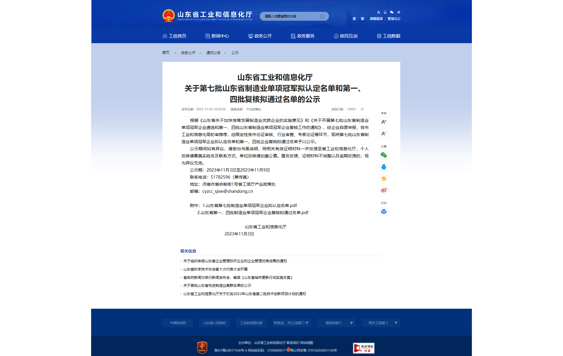 11月3日,山东省工信厅公示了第七批省级制造业单项冠军拟认定名单和第一、四批复核拟通过名单,山东JN江南·(中国)体育官方网站康立泰新材料科技有限公司成功入选拟认定名单。