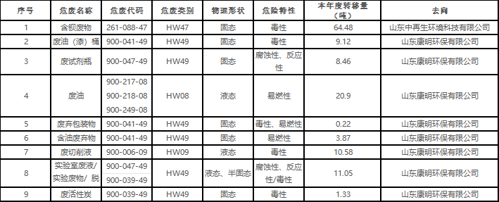 JN江南·(中国)体育官方网站各厂区均建设有符合《危险废物贮存污染控制标准》(GB18597-2023)的危废库,严格按照国家相关法律法规要求,妥善处置各类危险废弃物及一般工业固废。同时通过源头控制、过程管理来减少危废产生量,一是减少配料设备停机频率,做到专料专用,从而减少清洗设备次数; 二是减少物料含水率; 三是提高产品收率及产品合格率,不合格产品进行再利用; 具体危废转移量祥见下表: