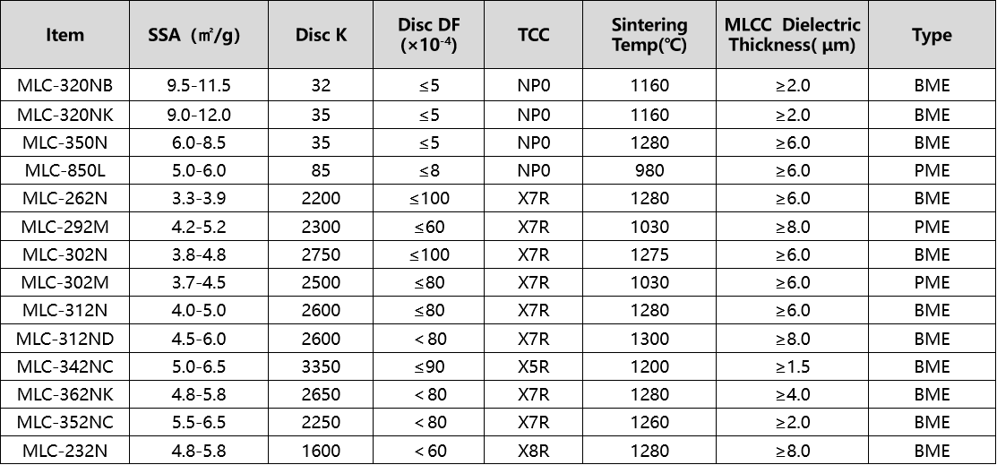 介质材料(配方粉)是制作多层陶瓷电容器(MLCC)的关键基础材料。MLCC主要用于储存电荷、旁路、滤波、调谐、震荡等方面,是各种电子、通讯、信息、军事及航天等消费或工业用电子产品的重要组件。由于其小体积、结构紧凑、可靠性高及适于SMT技术等优点而发展迅速。我们一直致力于高可靠、更安全、环保、小型化、薄层化的MLCC介质材料研发与生产。可提供C0G、X8R/X7R/X5R、Y5V等全系列MLCC介质材料,持续满足顾客对MLCC介质材料薄层化、高可靠、高性价比的需求。