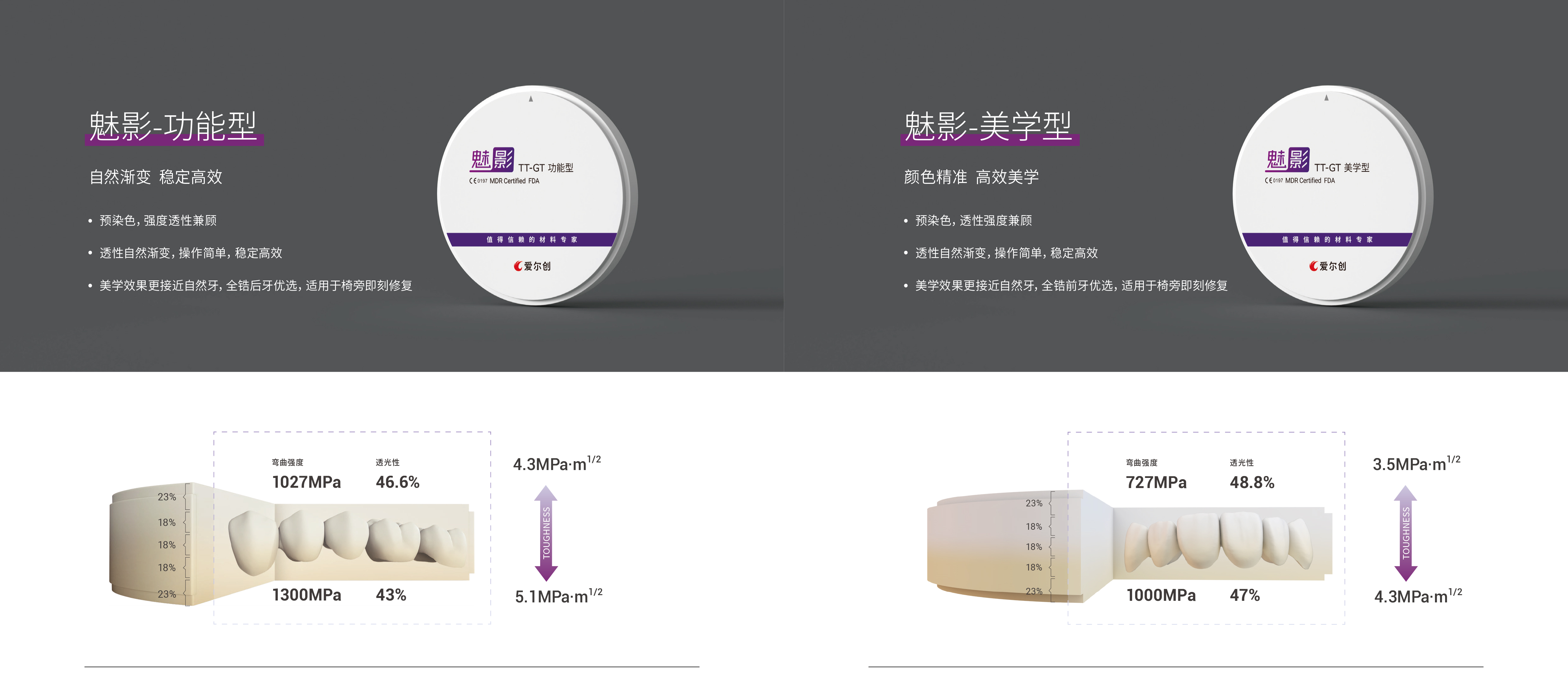 爱尔创全瓷义齿用氧化锆陶瓷是多晶陶瓷类义齿修复材料,涵盖爱尔创瓷倍健、爱尔创魅影和爱尔创玉瓷三大义齿品牌。魅影旗下材料具有透性、强度、颜色等多维度渐变工艺操作简单,兼具功能和美学修复,是标准化工艺修复和椅旁CAD/CAM工艺修复首选氧化锆材料。