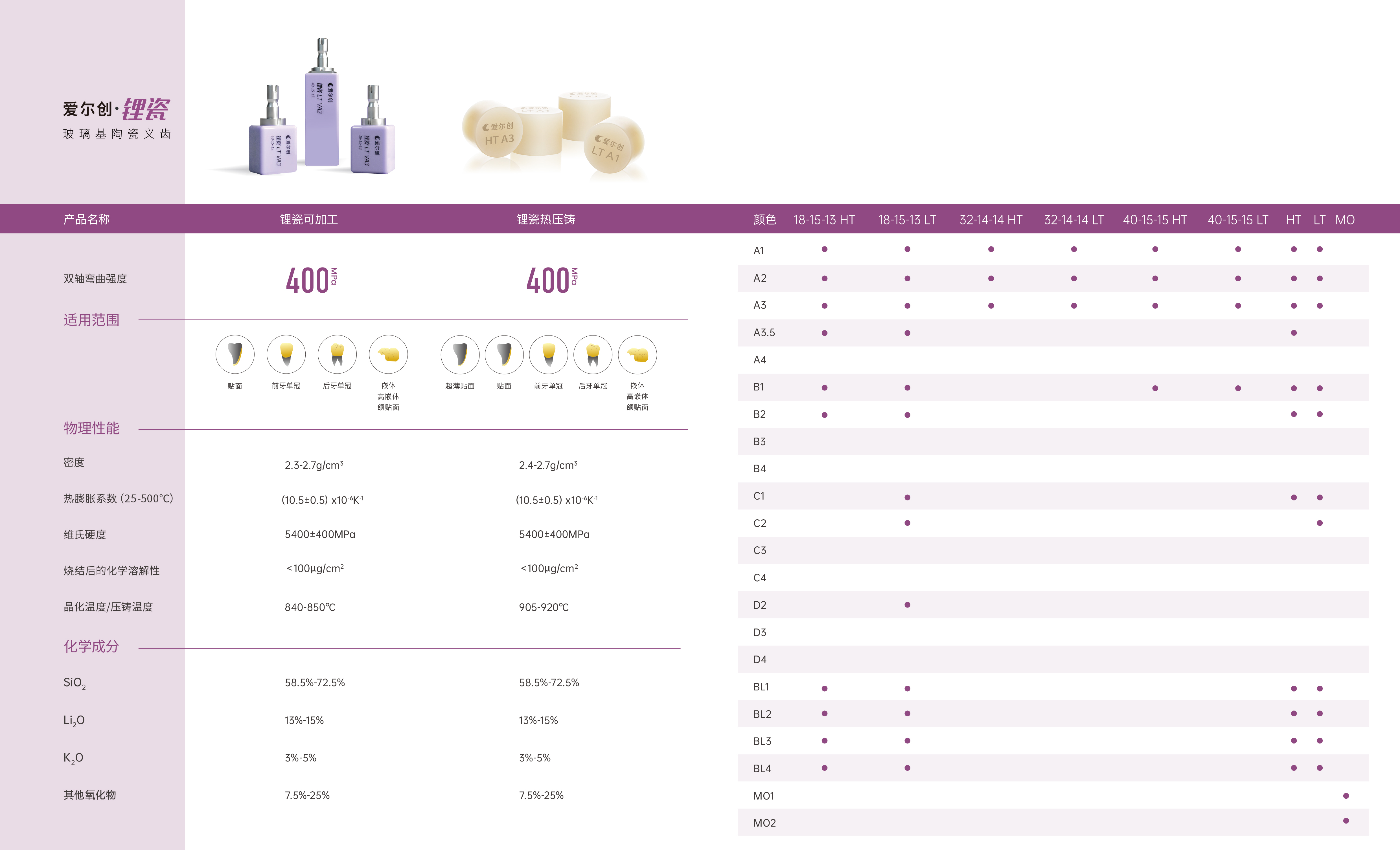 爱尔创全瓷义齿用二硅酸锂玻璃陶瓷是玻璃基陶瓷类义齿修复材料,锂瓷旗下两款产品UP.CAD和UP.PRESS适用于标准化工艺修复和CAD/CAM工艺修复,UP.CAD主用于椅旁CAD/CAM工艺修复的单颗快速美学修复,UP.PRESS 主用于热压铸工艺修复的美学贴面修复或前牙三连桥美学修复。此产品完全结晶后弯曲强度可达400MPa,透性和光泽效果接近自然色,且具有良好的临床粘接效果。