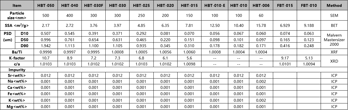 钛酸钡是电子陶瓷中使用最广泛的材料之一,被誉为“电子陶瓷工业的支柱”,主要用于制造多层陶瓷电容器(MLCC)、单板陶瓷电容器、热敏电阻、压电陶瓷、微波陶瓷等电子 元器件。依托水热法关键制备技术,公司已发展成为全球最大的生产超细纳米钛酸钡粉体的企业。生产的水热钛酸钡粉体具有高纯度、高活性、球形度好、结晶度高、粒度分布窄、化学均一性好等特点,尤其适用于MLCC介质材料领域。目前,已研制出高品质的纳米级四方相钛酸钡,引领业界高水平。采用纳米原材料以及纳米材料善分散技术及烧结技术,生产了300、400、500nm等不同规格的钛酸钡。